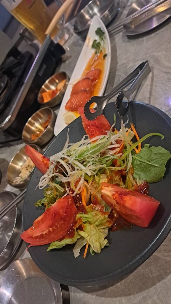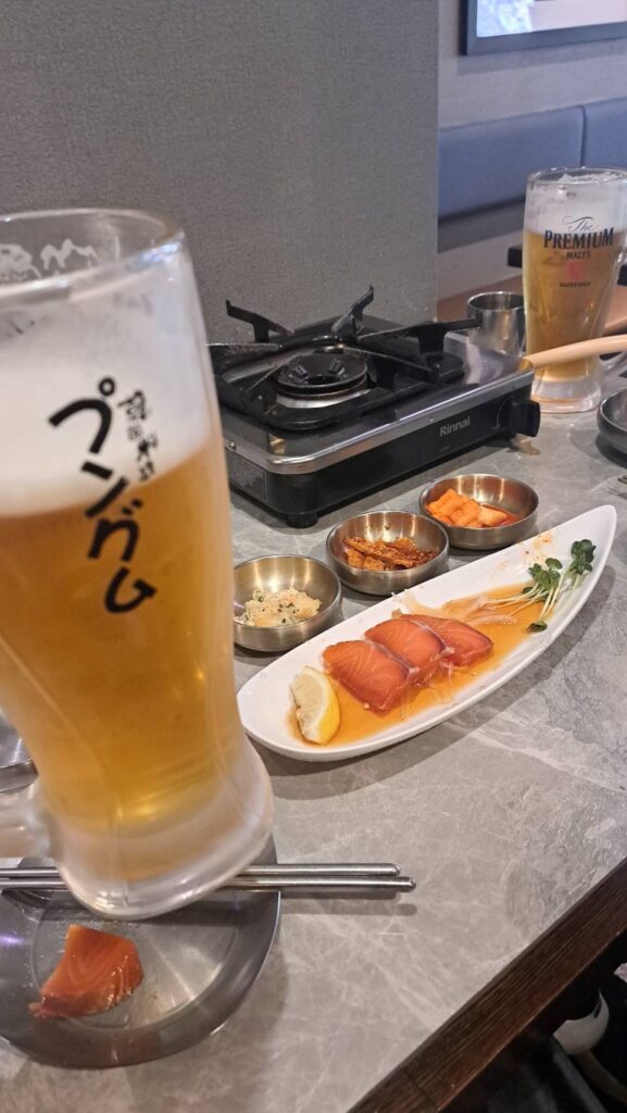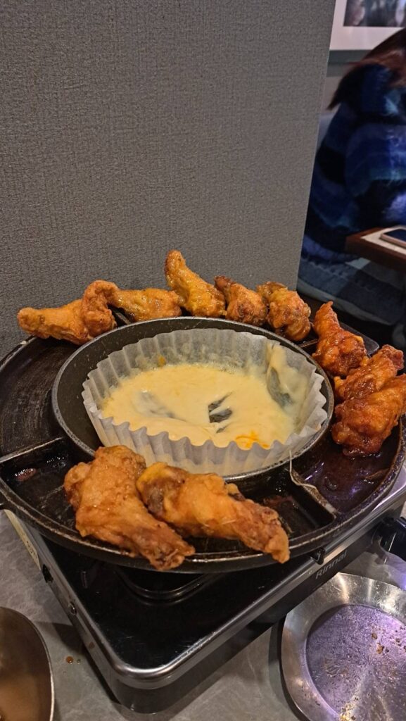 「プンムグ本店」では、韓国サラダやカンジャンサーモン、チーズフォンデュの韓国チキン、さらにタコの踊り食いまで堪能💖
