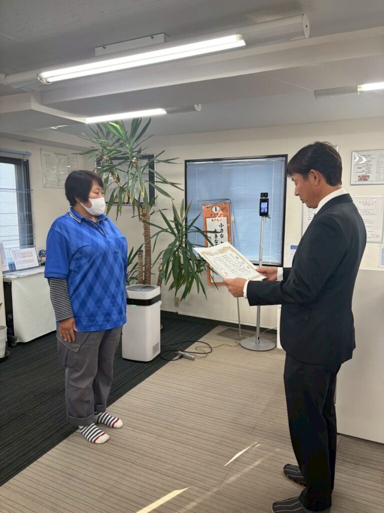 今年も年間表彰が発表され、埼玉営業所からは優秀賞1名、優良賞2名が選出されました。表彰式では日頃の功績を称え、一ノ瀬社長より表彰状と金一封が贈られました。