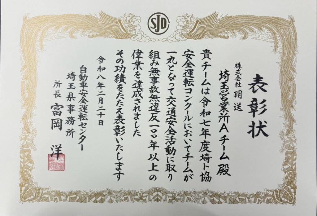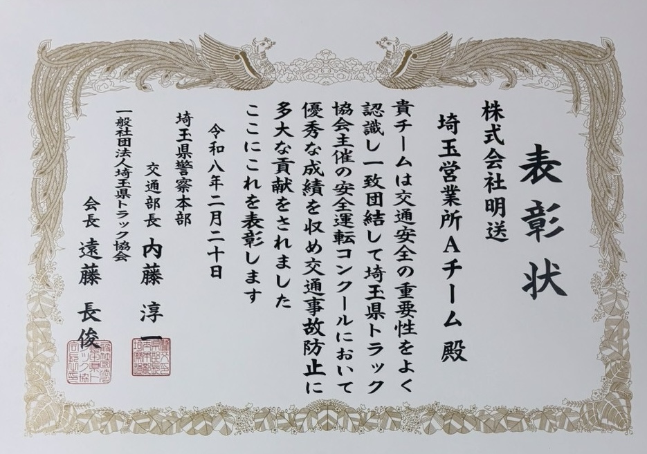 今年も埼玉県トラック協会主催の安全運転コンクールに参加いたしました。約半年間にわたる実施期間中、参加ドライバー全員が公私ともに安全運転の意識を高め、日々の業務に取り組んでまいりました。